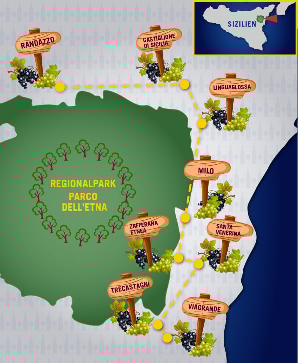 Sizilien versteht es nicht nur auf Grund seiner Geschichte, Kultur, Kunst, und Natur attraktiv zu erscheinen, sondern auch wegen den intensiven und vollmundigen Aromen des Weiß- und Rotweines. Wir wollen euch die Gelegenheit bieten, all diese Weine auf einer zweitägigen Tour, der touristischen Weinstraße des Ätna kennenzulernen.
