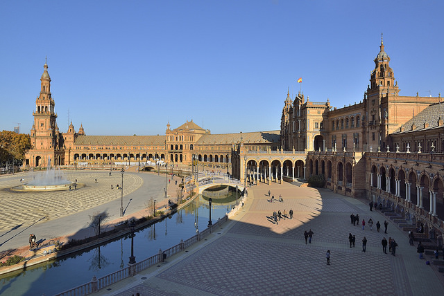 Der hübsche Plaza de España in Sevilla wurde umgewandelt in den Theed Palast auf dem Planeten Naboo in Star Wars Episode I.