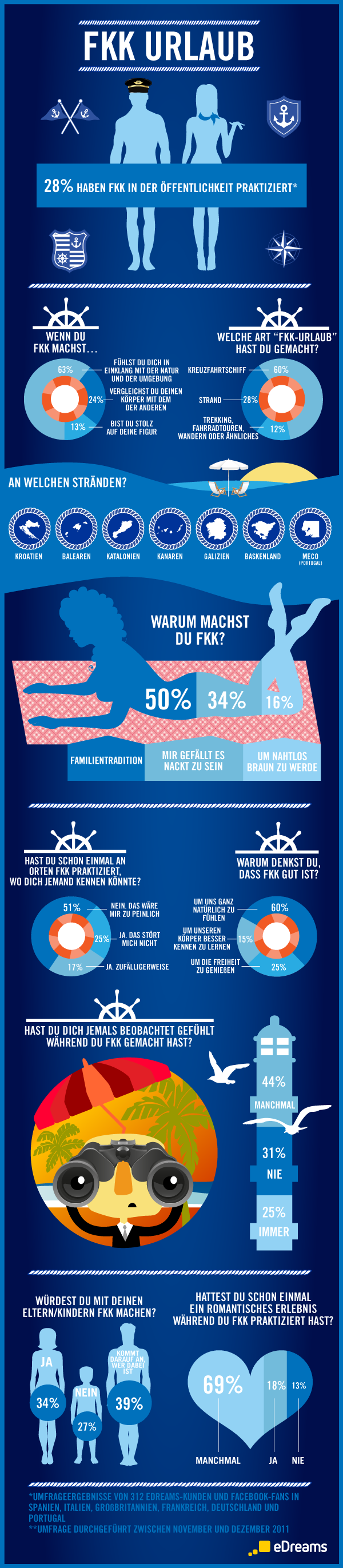 Habt ihr jemals darüber nachgedacht euch nackt an den Strand zu legen, Fahrrad zu fahren oder eine Trekking-Tour in den Bergen zu unternehmen? Der Gedanke, diese Aktivitäten ohne Kleidung zu unternehmen, ist für Viele abschreckend, aber es wird euch überraschen, dass es eine Menge Leute gibt, die schon einmal FKK-Urlaub gemacht haben. Laut der eDreams FKK-Umfrage haben fast ein Drittel der Kunden und Facebook-Fans aus ganz Europa an einem öffentlichen Ort FKK praktiziert.