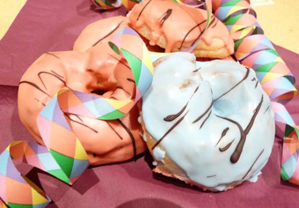 Für die Faschingskrapfen funkioniert dasselbe Rezept, wie für die Berliner. Man kann auch Krapfen in Form von Ringen, ohne Füllung machen. Auf dem Foto wurden die Krapfen statt mit Zucker mit einer Puderzuckerglasur (aus Puderzucker, Zitronensaft und Lebensmittelfarbe) bestrichen.