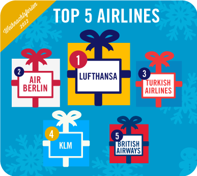 Bekannte Billigflieger und Low Cost Airlines haben unter den während der letzten 10 Monate eingegangenen Buchungen nur einen erstaunlich geringen Anteil. Den Löwenanteil der Flüge von deutschen Airports buchten die Weihnachtsurlauber mit Lufthansa (26%!). Air Berlin, die sich vom Low Cost Segment immer mehr zur klassischen Fluglinie gewandelt hat, belegt mit 13% Platz 2 der meistgebuchten Airlines für die diesjährigen Weihnachtsferien. Während Lufthansa Flüge sowohl nach Bangkok als auch nach Berlin, also relativ unabhängig von der Entfernung des Reiseziels gebucht wurden, konnte Air Berlin hauptsächlich bei Flügen nach Wien, zu unseren östereichischen Nachbarn punkten.