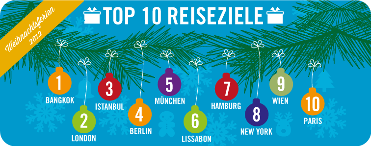 Gesamtergebnis: Europaweit sind New York, London und Bangkok 2012 die erklärten Lieblingsziele der Weihnachtsurlauber.
